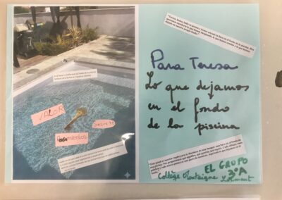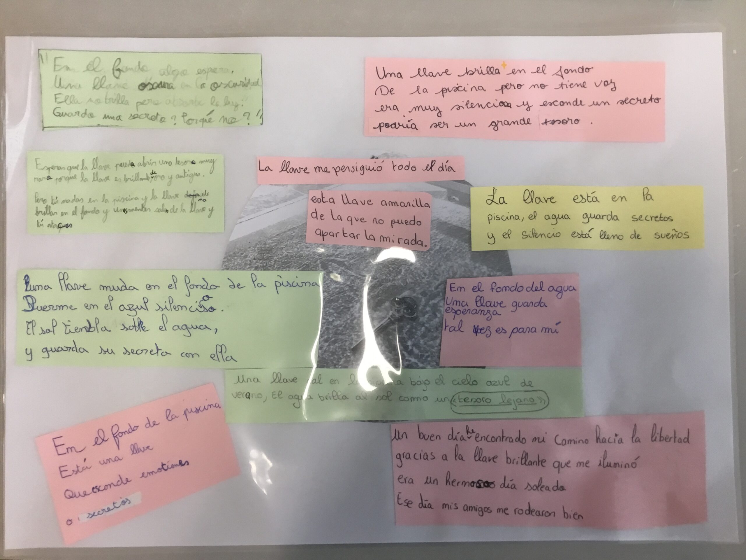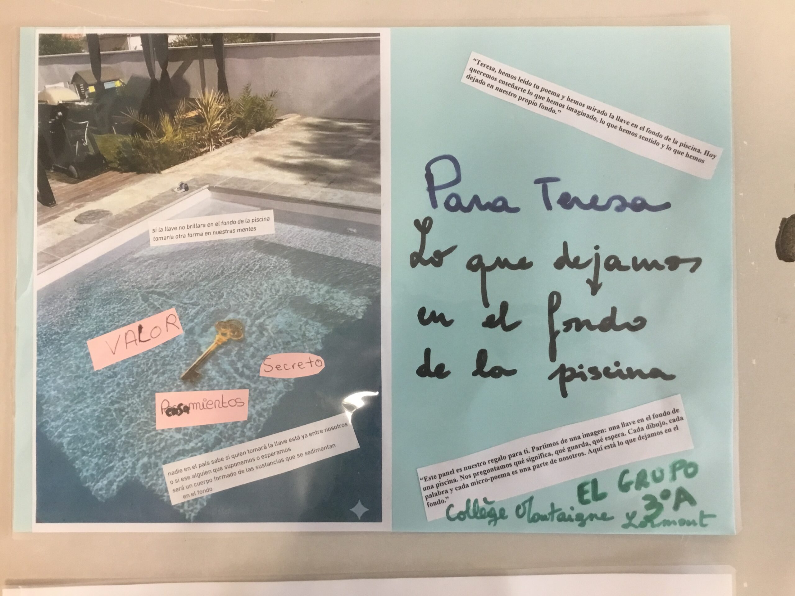Pourquoi une clé dans une piscine ? Mais, que fait cette clé au fond de la piscine ? Et qu’est-ce que je vais pouvoir y déposer ? Ce sont les interrogations de nos élèves 3A, après l’étude d’un poème de Teresa Cabrera, poétesse péruvienne venue à notre rencontre.